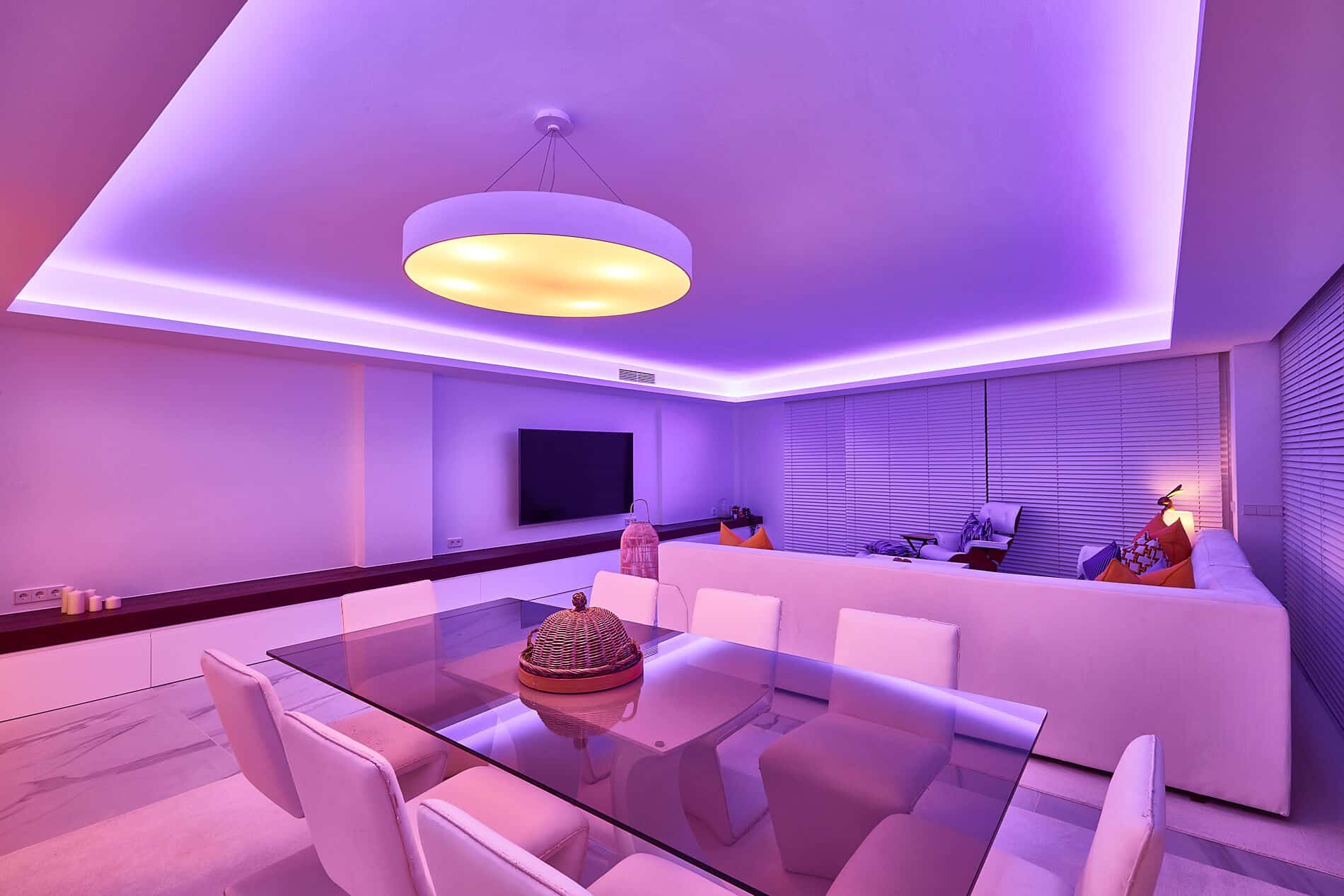 La tecnología LED permite configurar distintos colores e intensidades que se regulan de manera inteligente. En este proyecto los distribuimos en un techo foseado y logramos cambiar totalmente la atmósfera de la sala.